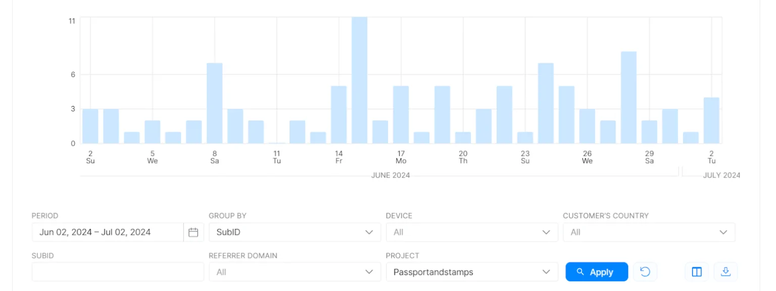 For each brand’s partner program, you can read stats to understand what works, what doesn’t, and what needs a quick fix. Every project is different, and we love analyzing each to maximize profit and serve our audiences better. The globetraffichub.org dashboard lets you group by date range, project, devices, and customer country.